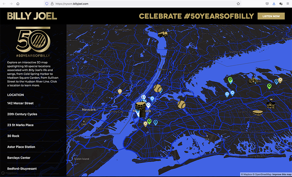 ビリー・ジョエルが、ソロとしてのキャリア50周年を記念し、彼の人生と曲に関連したニューヨークのランドマーク50か所を紹介するインタラクティヴ・3Dマップ・サイト「New York State of Mind」を開設しました。