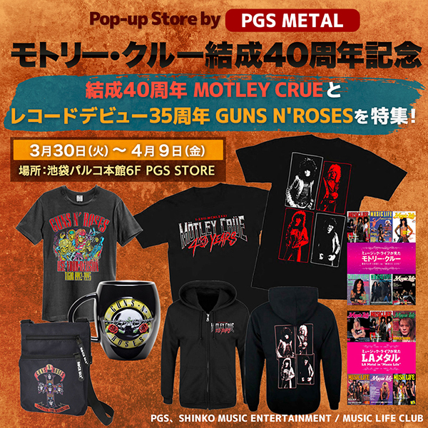 モトリー・クルー結成されたのが40周年! ガンズ・アンド・ローゼズ、レコード・デビュー35周年! それを記念してLAメタルのポップアップ・ストアが期間限定で開店@池袋です!